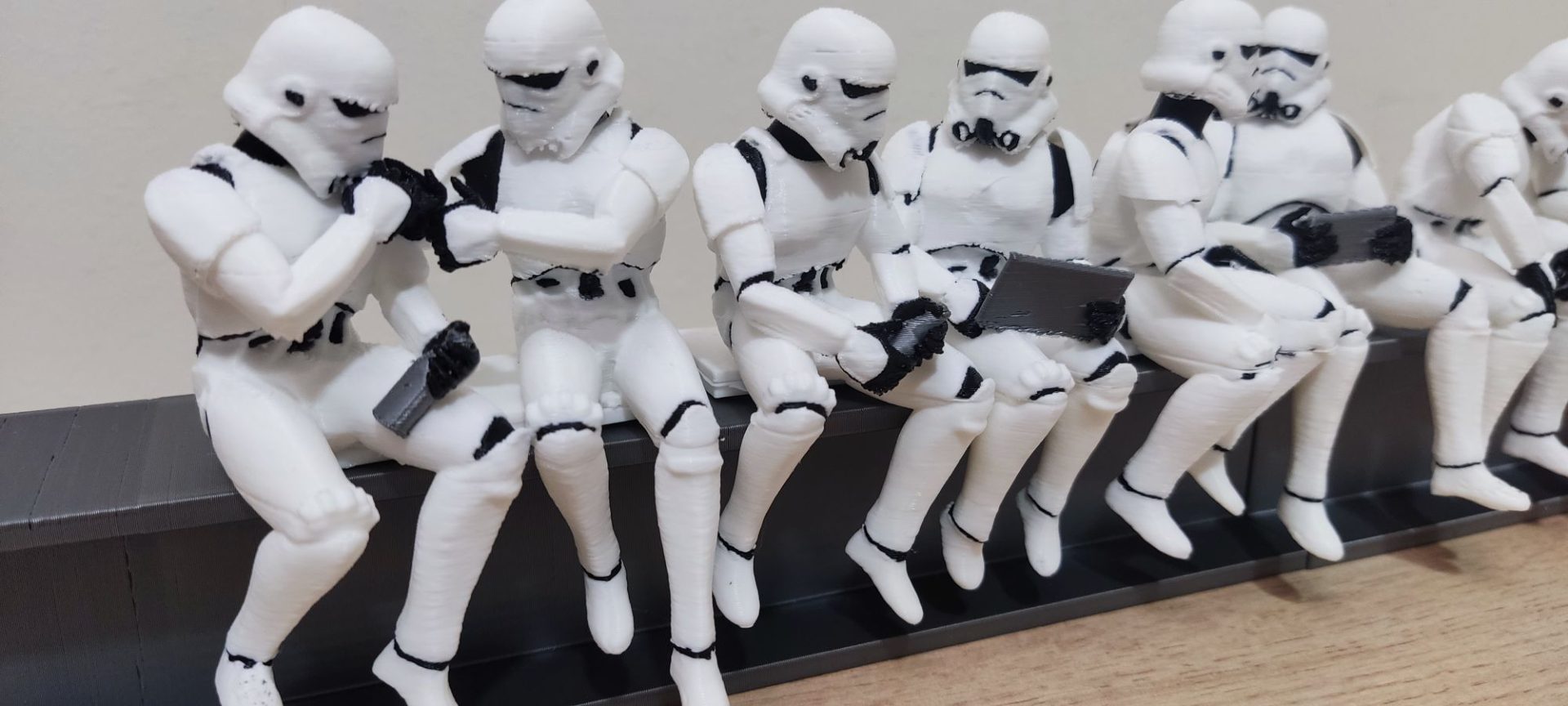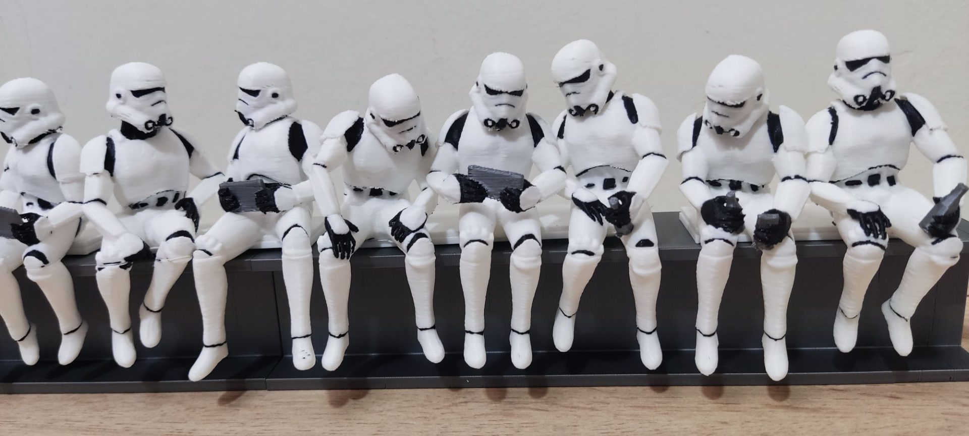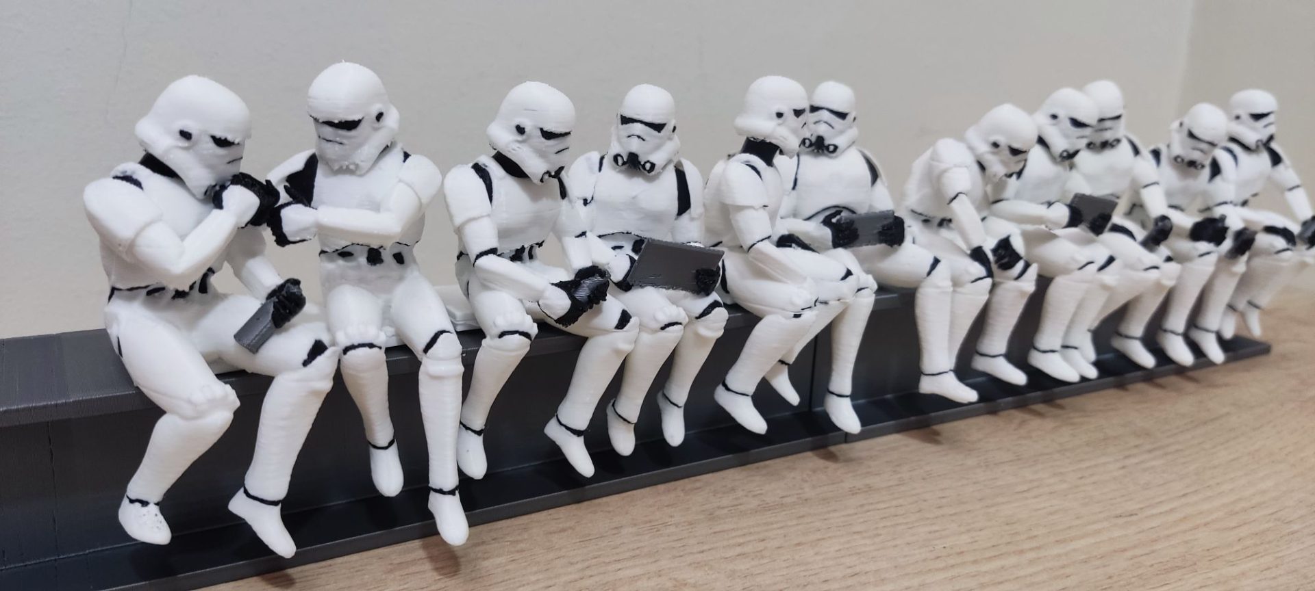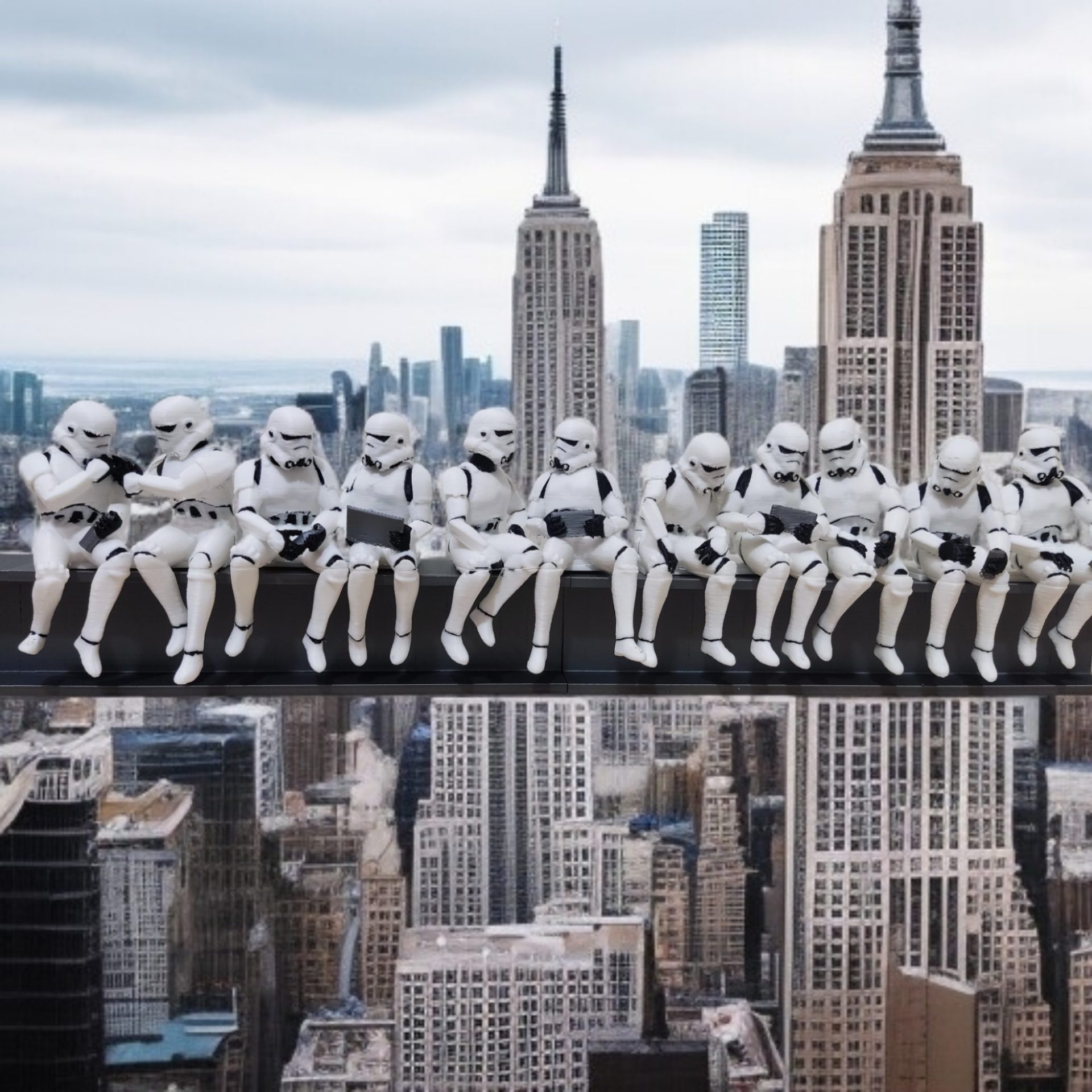 Disfruta de un escuadrón de Stormtroopers sentados en una viga, en un homenaje humorístico y original.