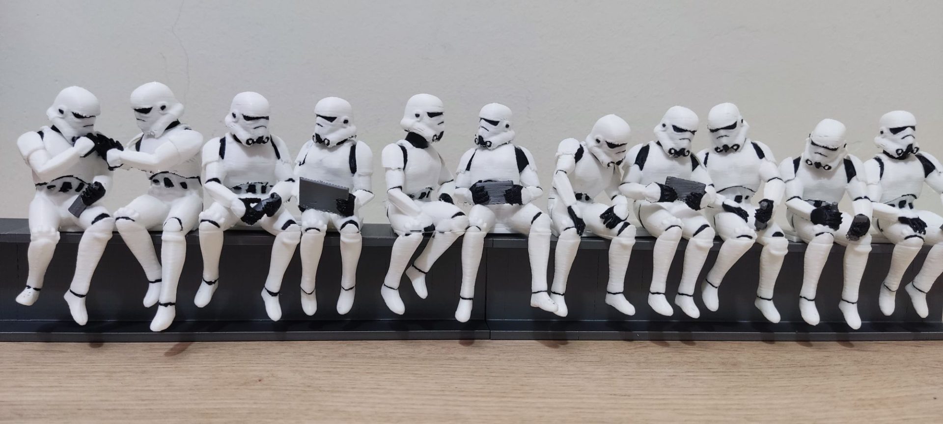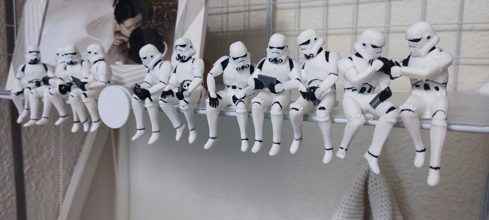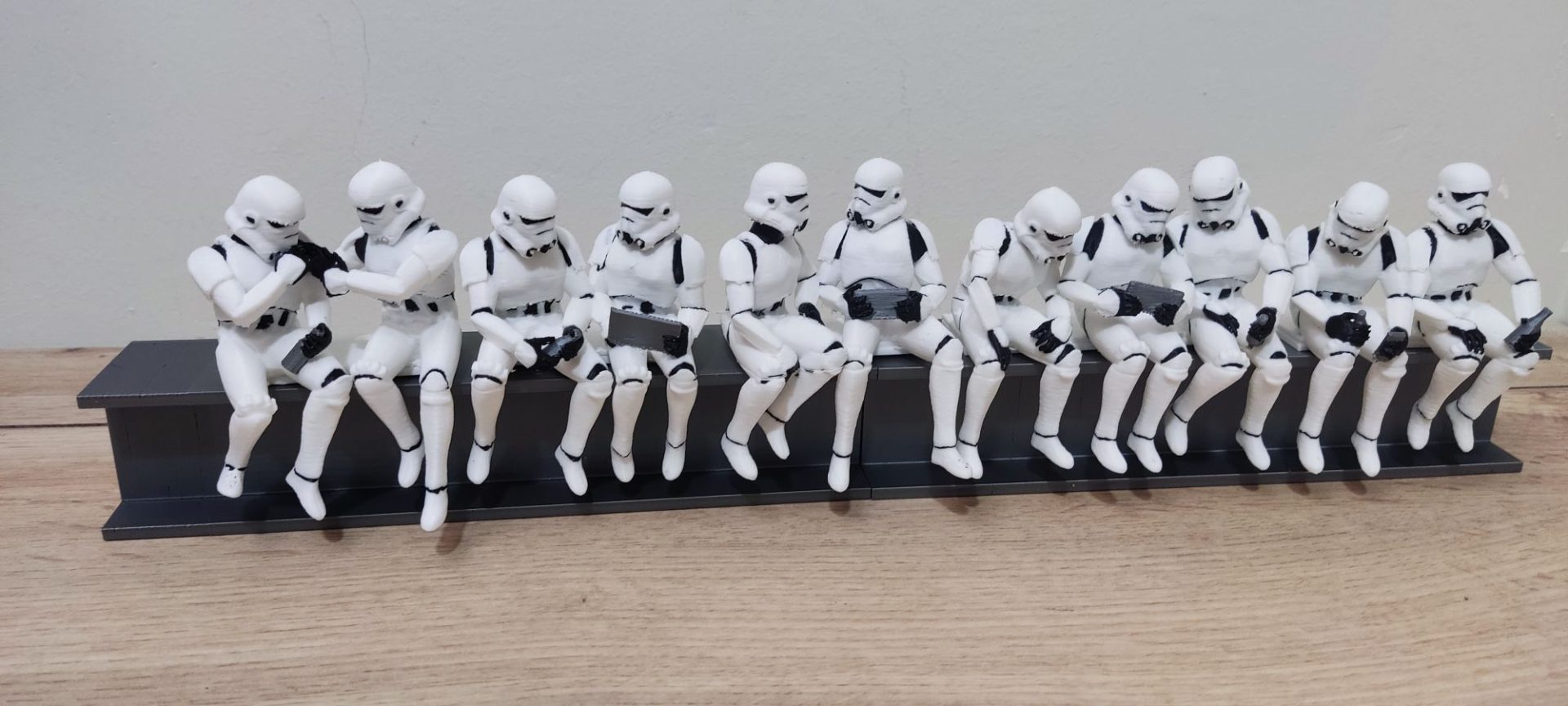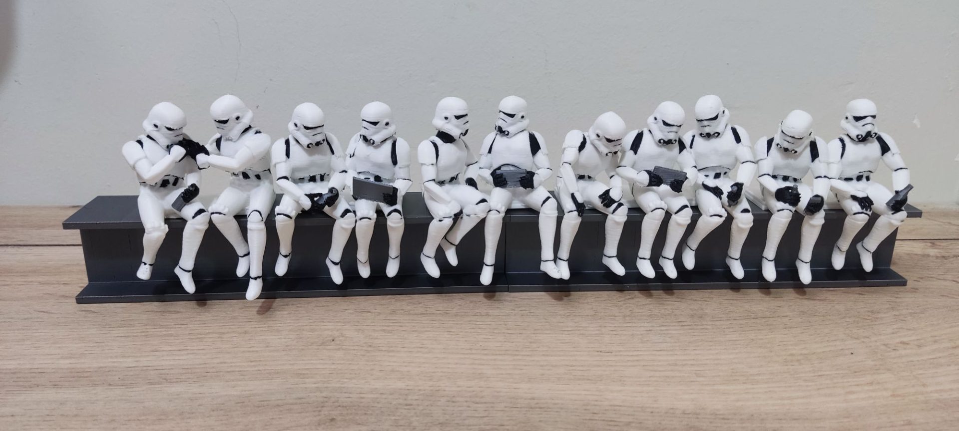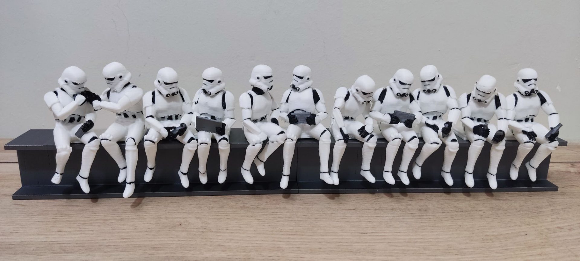 Disfruta de un escuadrón de Stormtroopers sentados en una viga, en un homenaje humorístico y original.