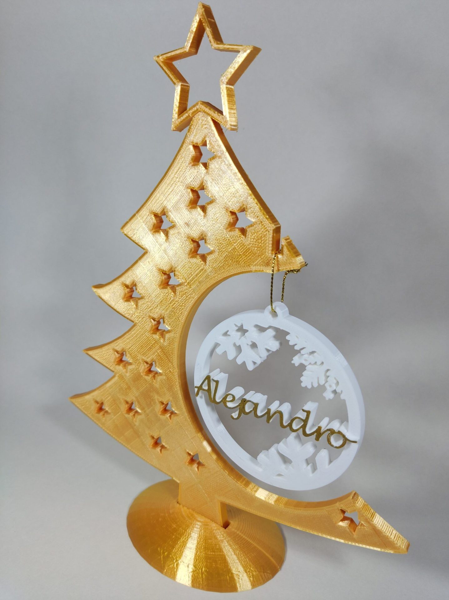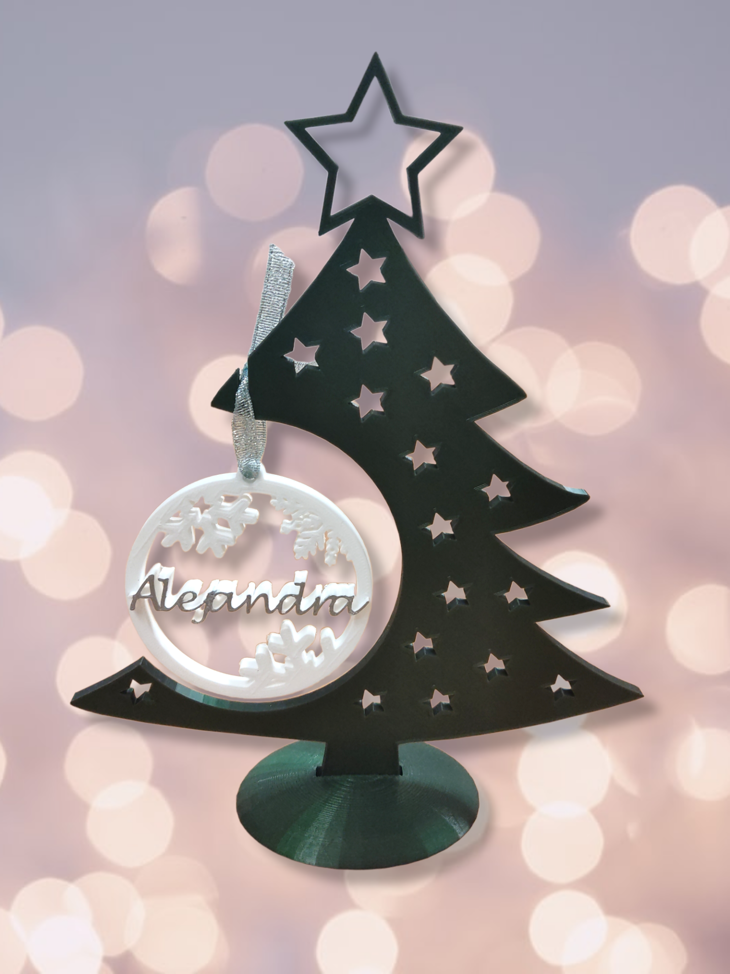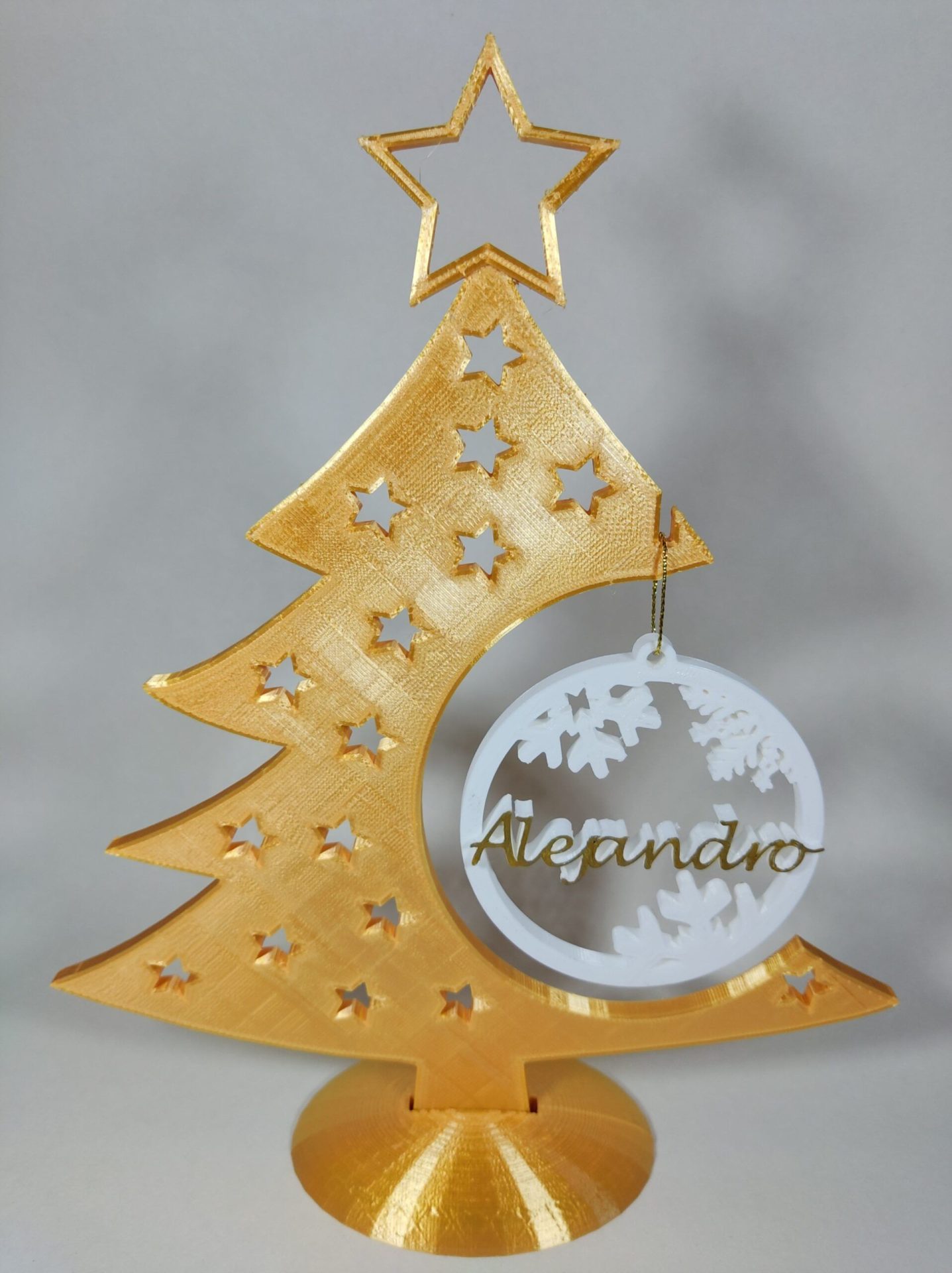 Árbol de navidad con bola personalizada decorado con estrellas, varios colores disponibles, bola personalizada con nombre incluida.