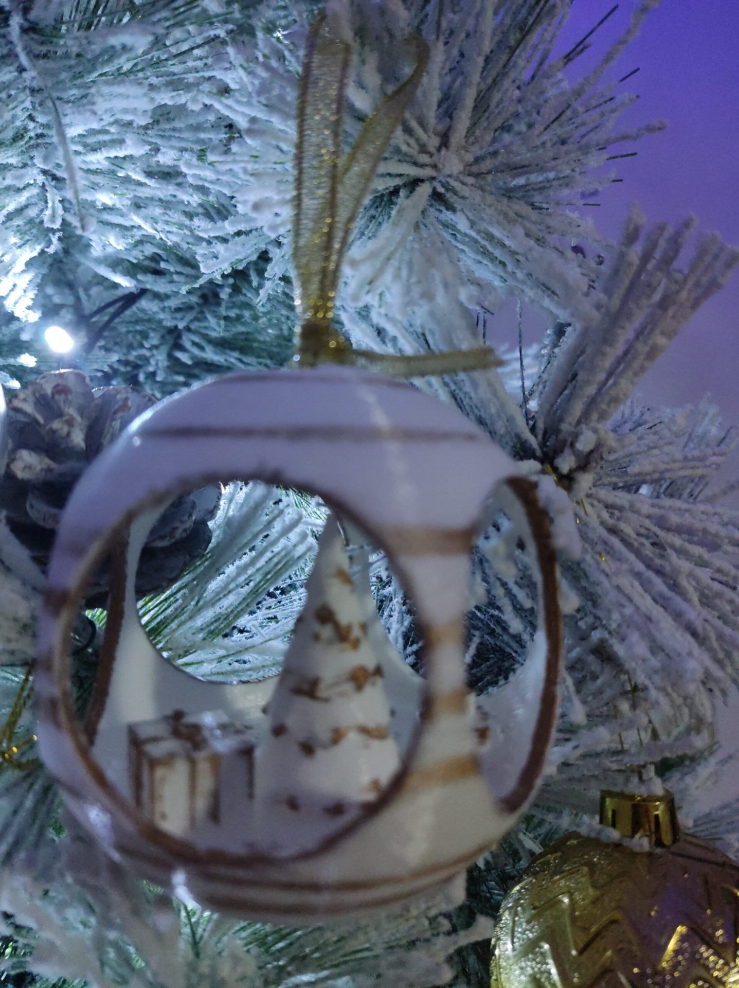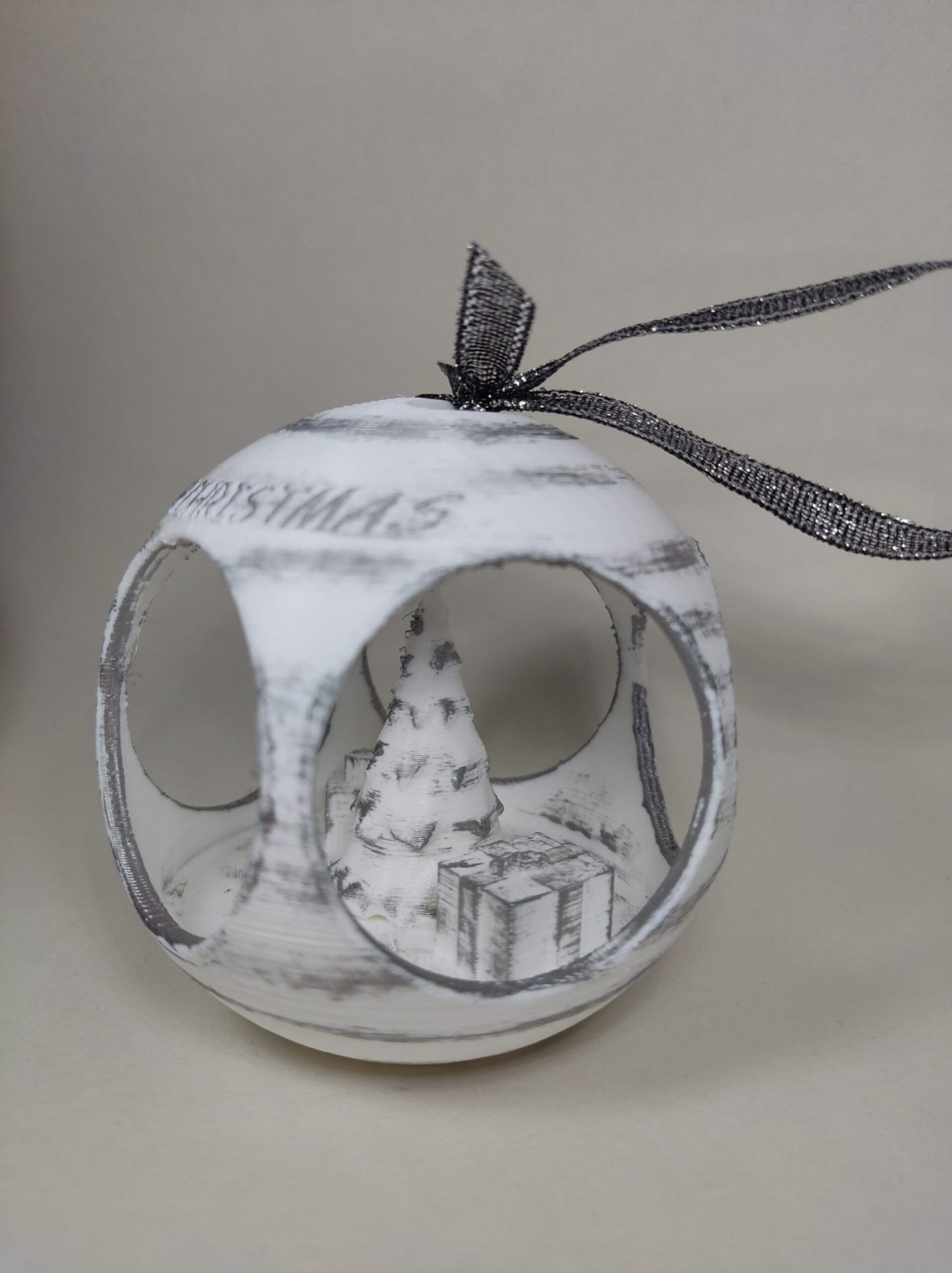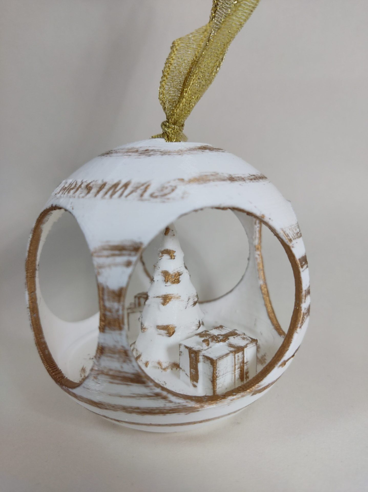 Bola de Navidad con árbol y regalos en su interior, personalizada con un cartel con el nombre que prefieras.