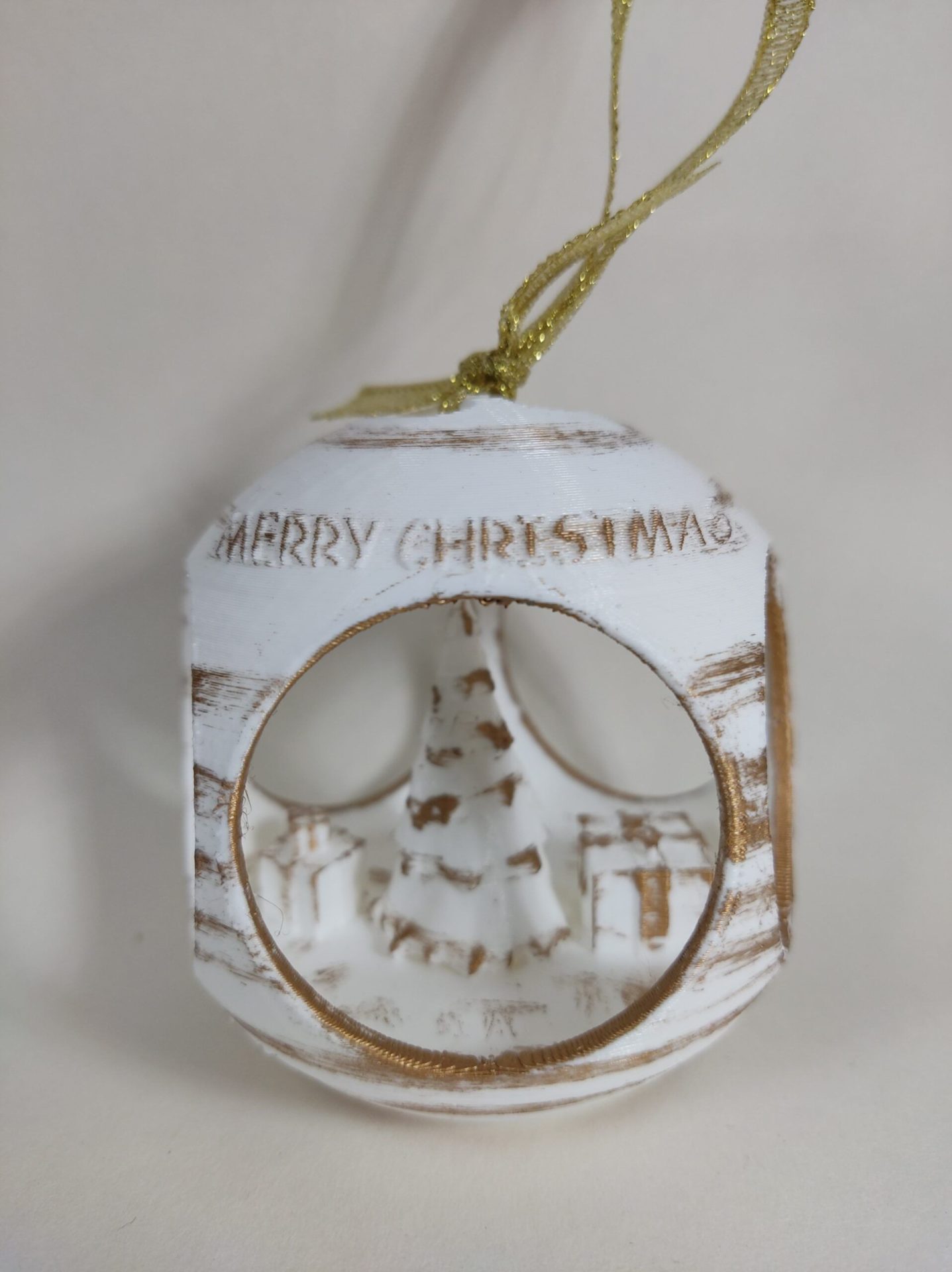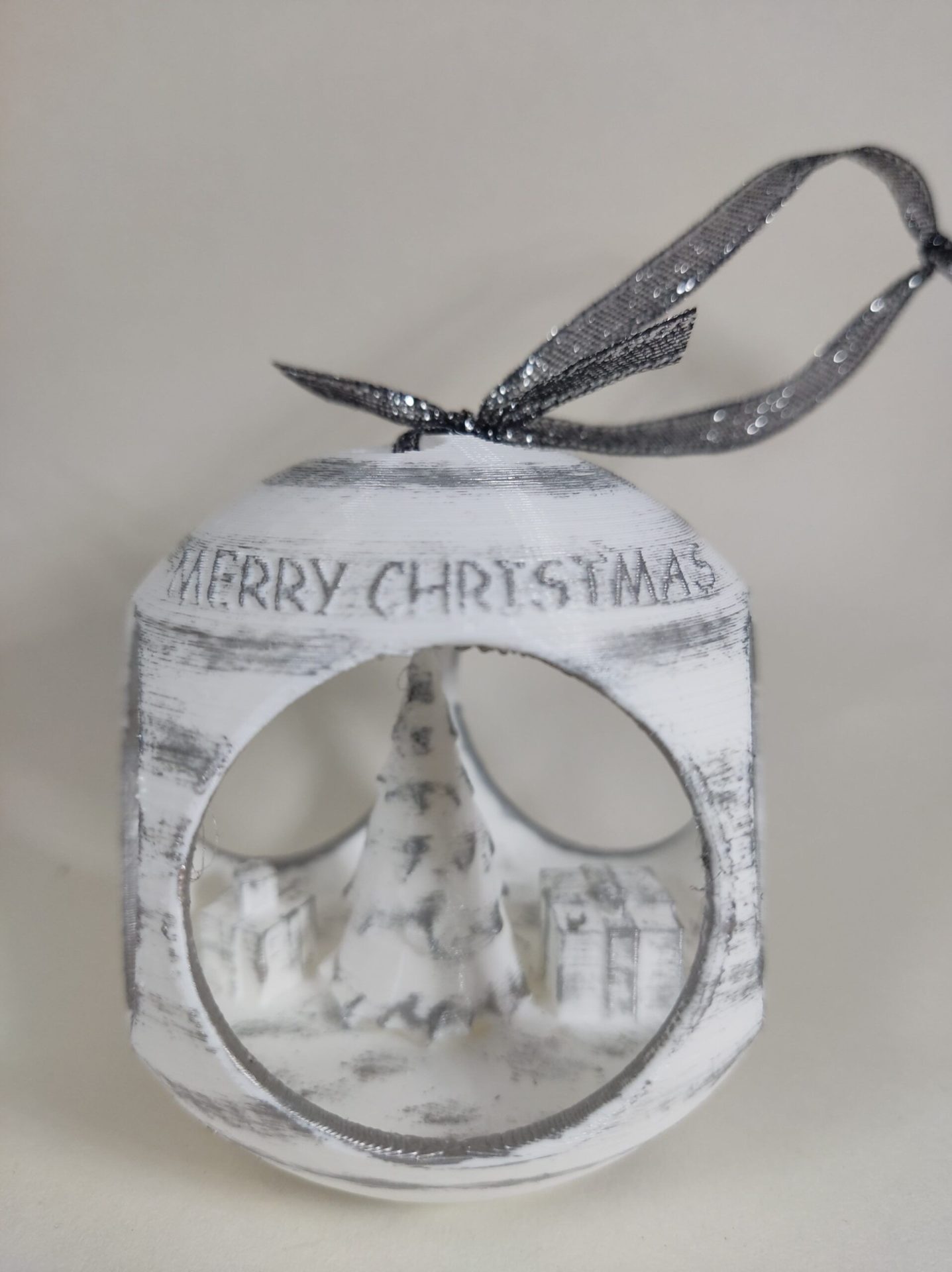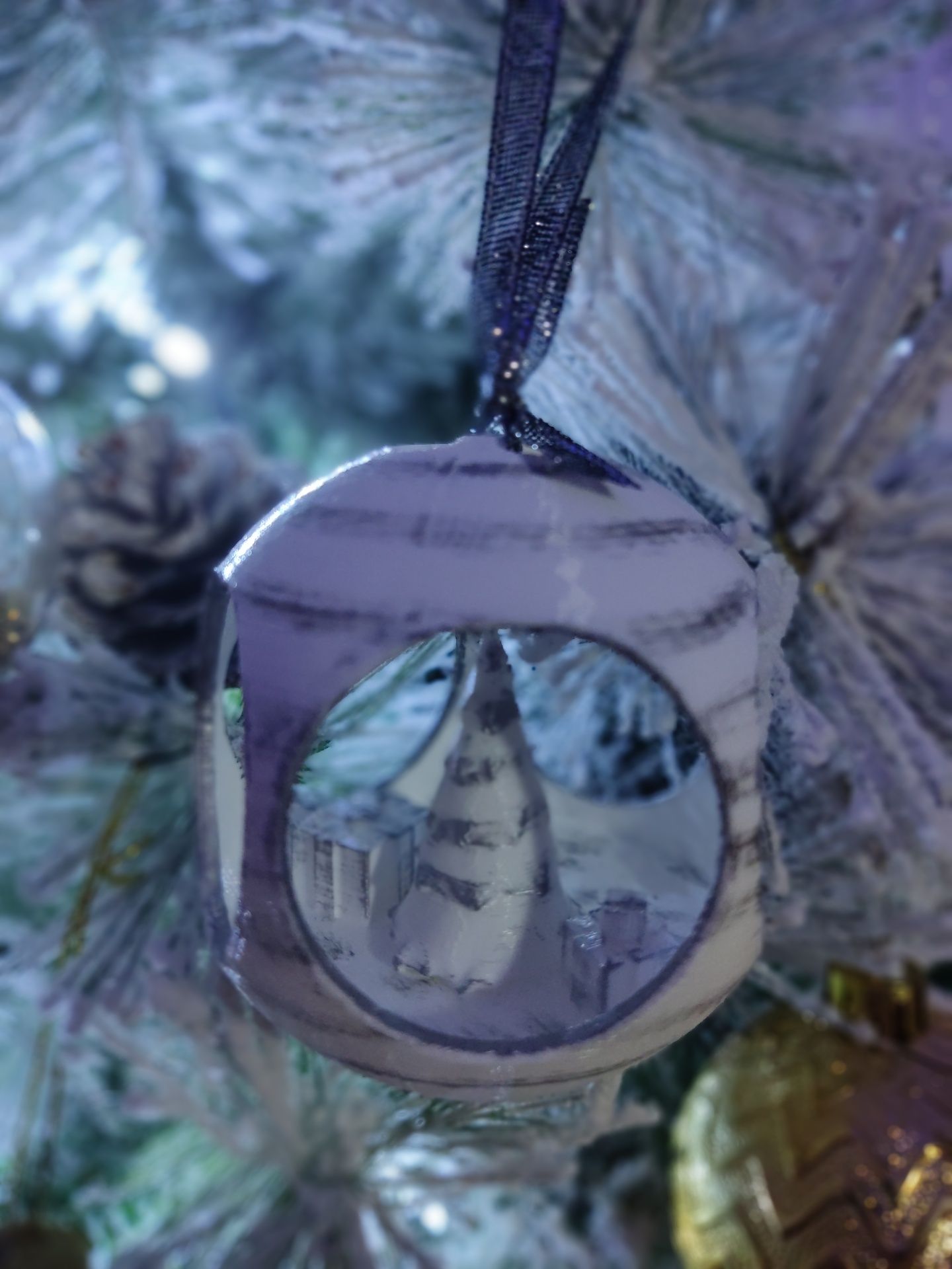 Bola de Navidad con árbol y regalos en su interior, personalizada con un cartel con el nombre que prefieras.