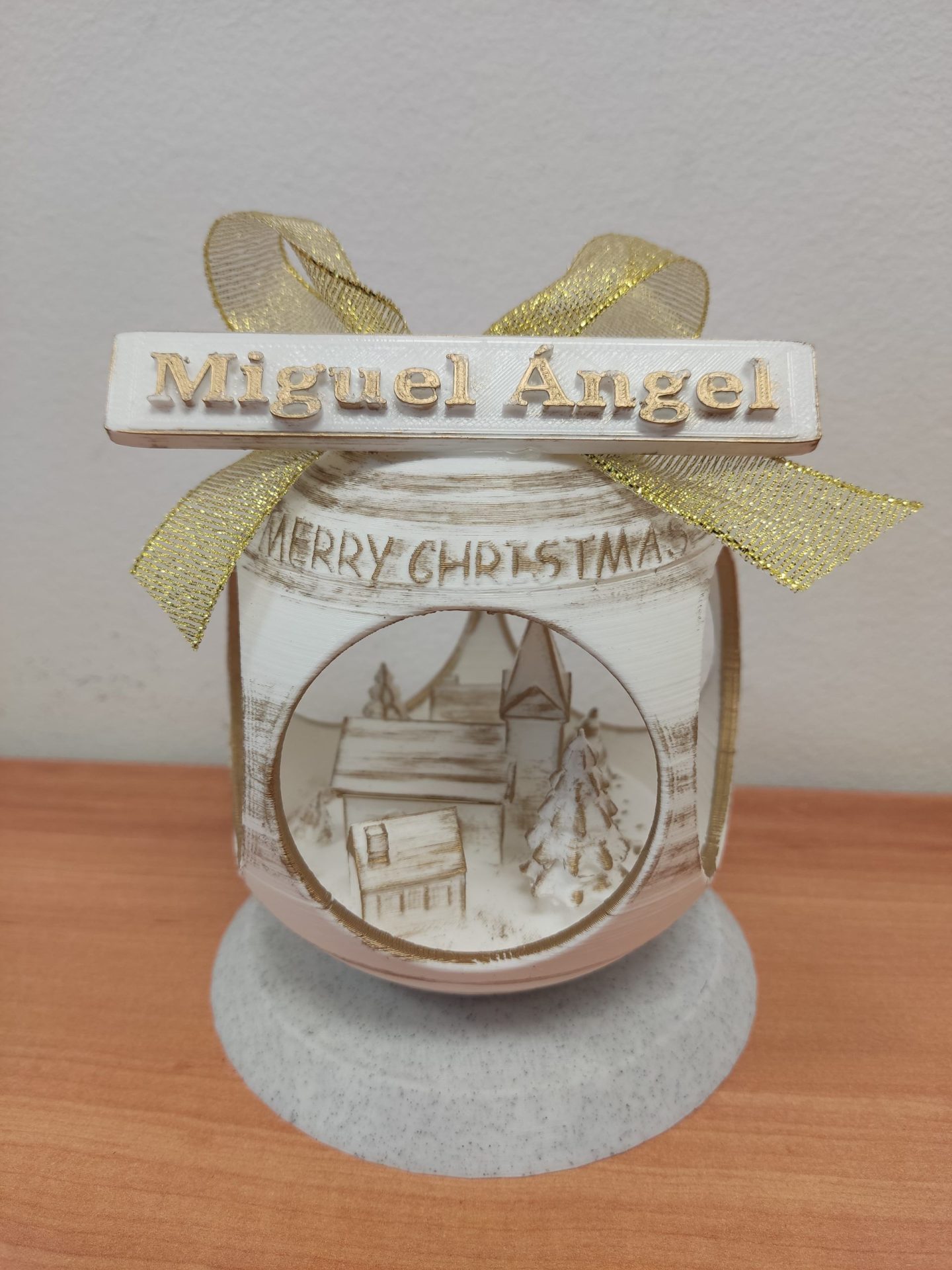 Bola de Navidad con pueblecito en su interior y personalizada con el nombre que prefieras y el color que más te guste, (dorada o plata) en un cartel.