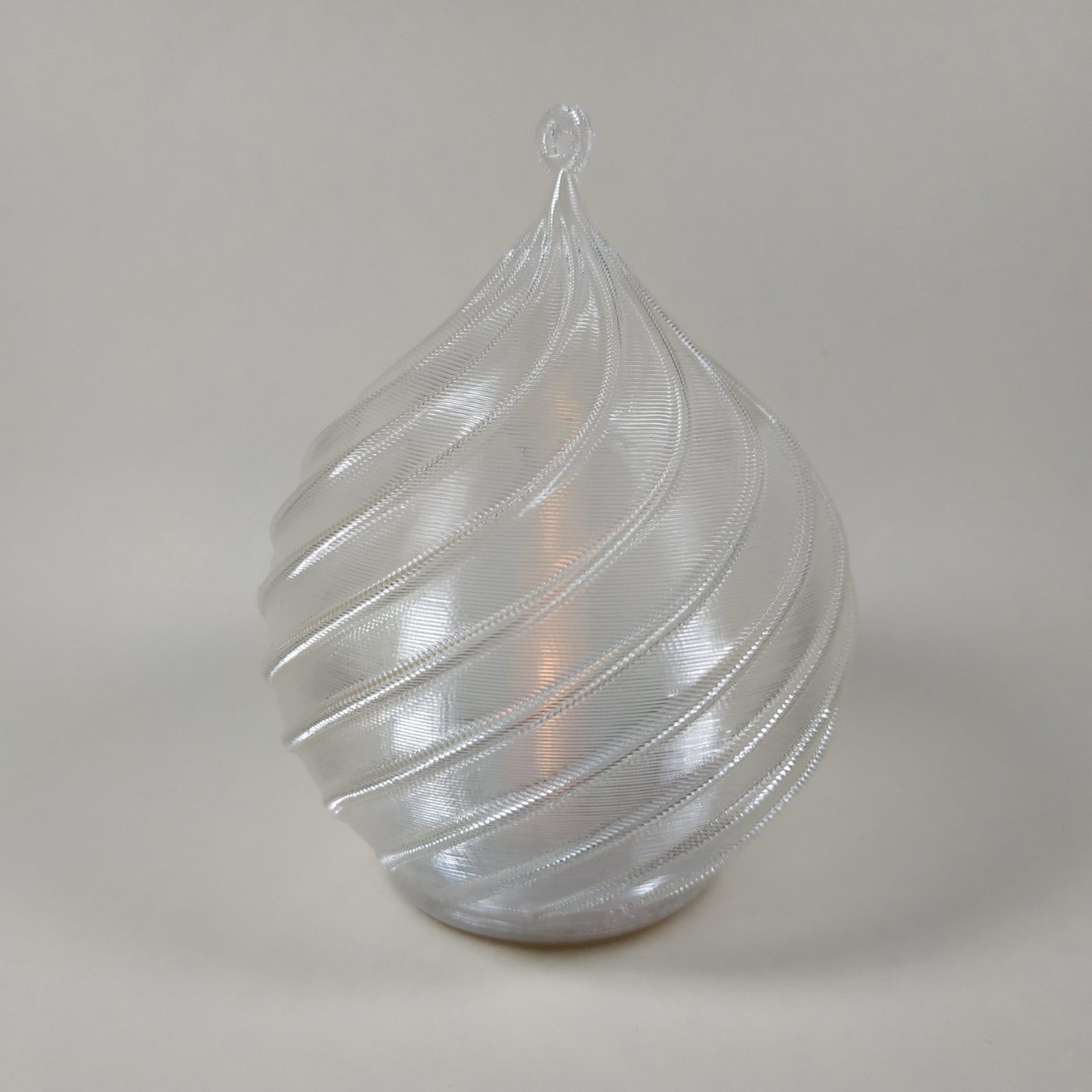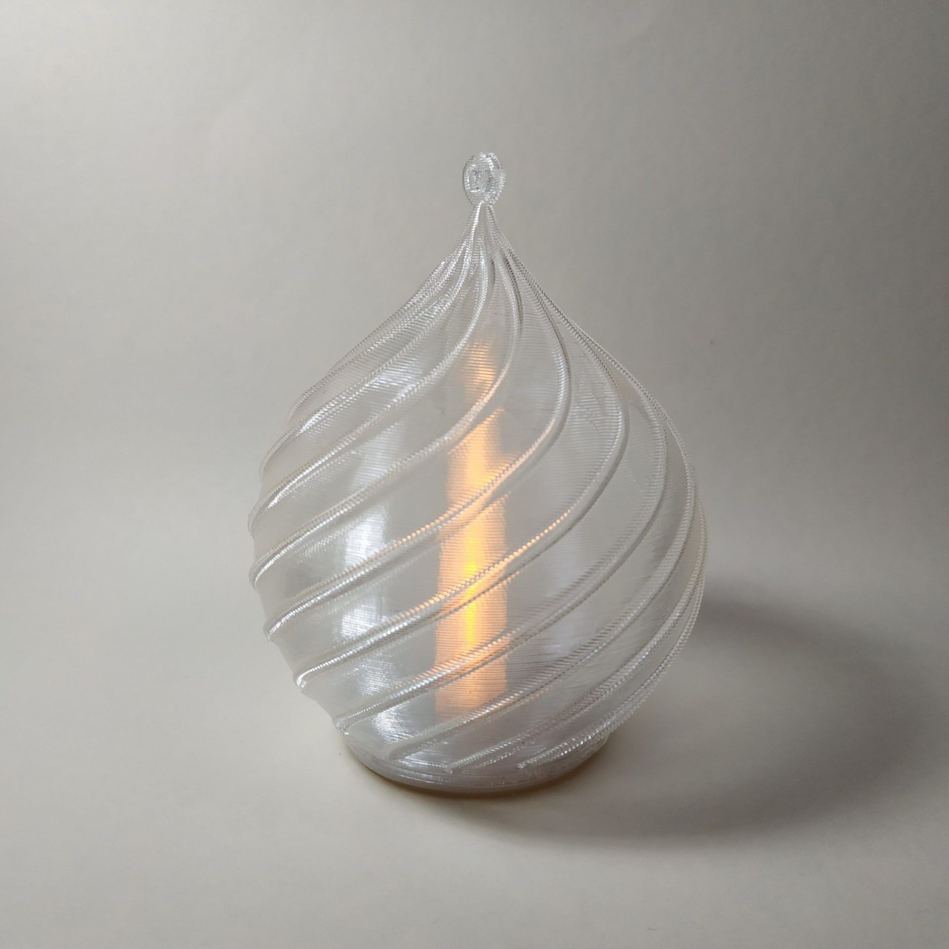 Bola de Navidad espiral con vela de led, color transparente para colgar en árbol o decorar, medidas: alto 78 mm, ancho 60 mm.