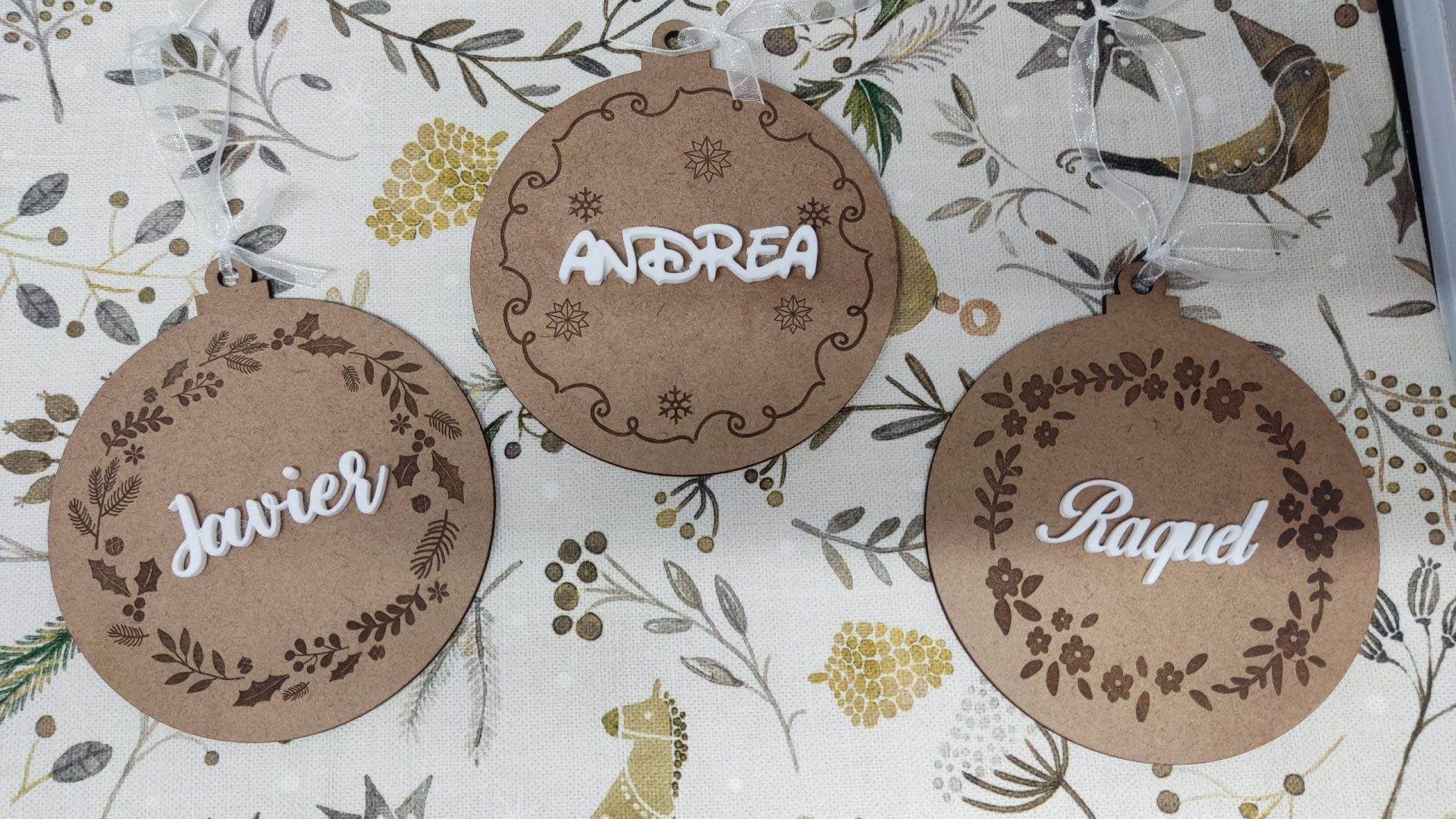 Bola de Navidad con guirnalda de flores cortada y grabada en madera.