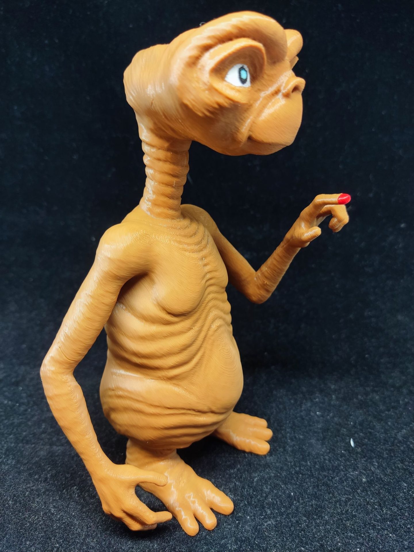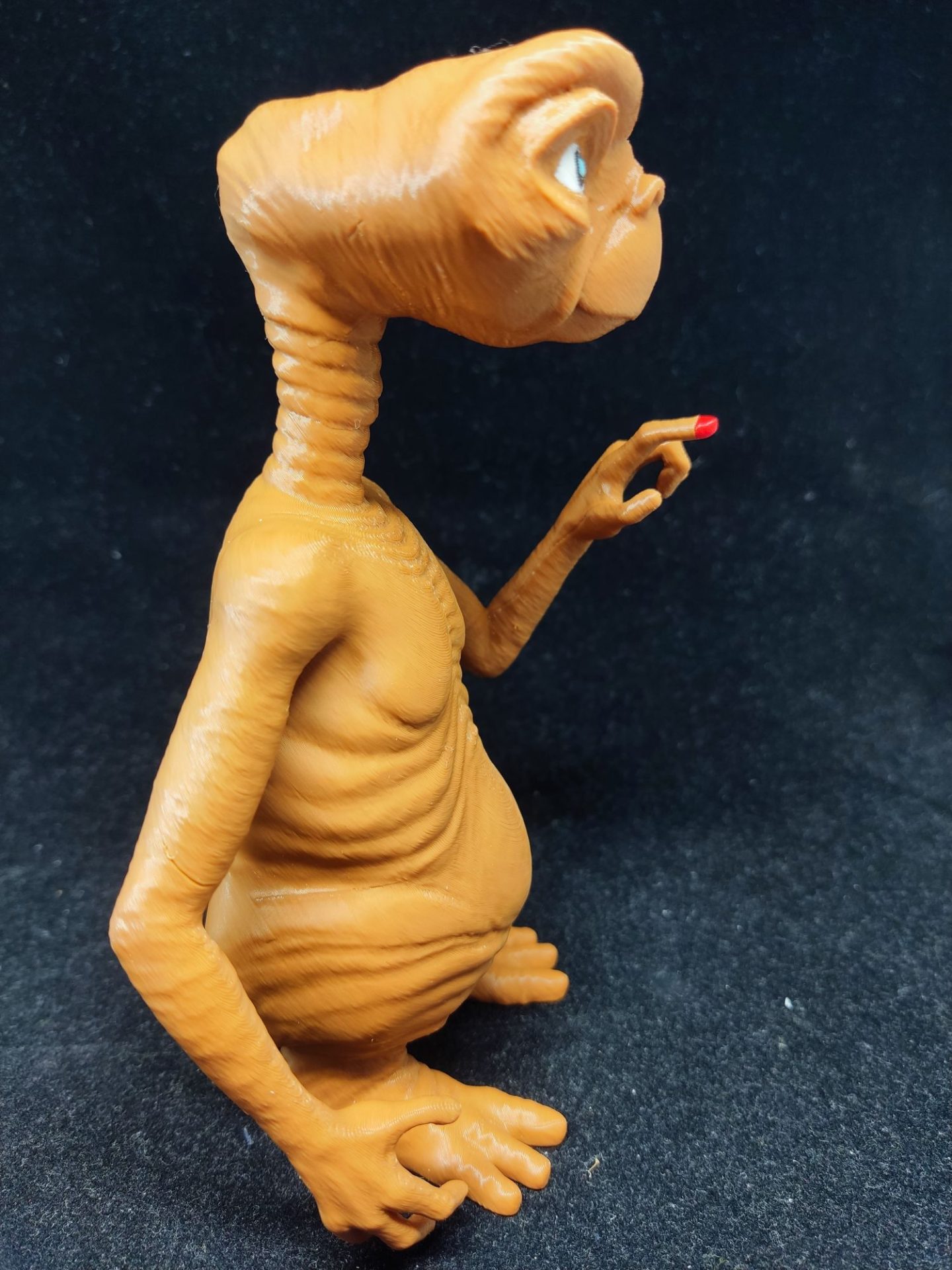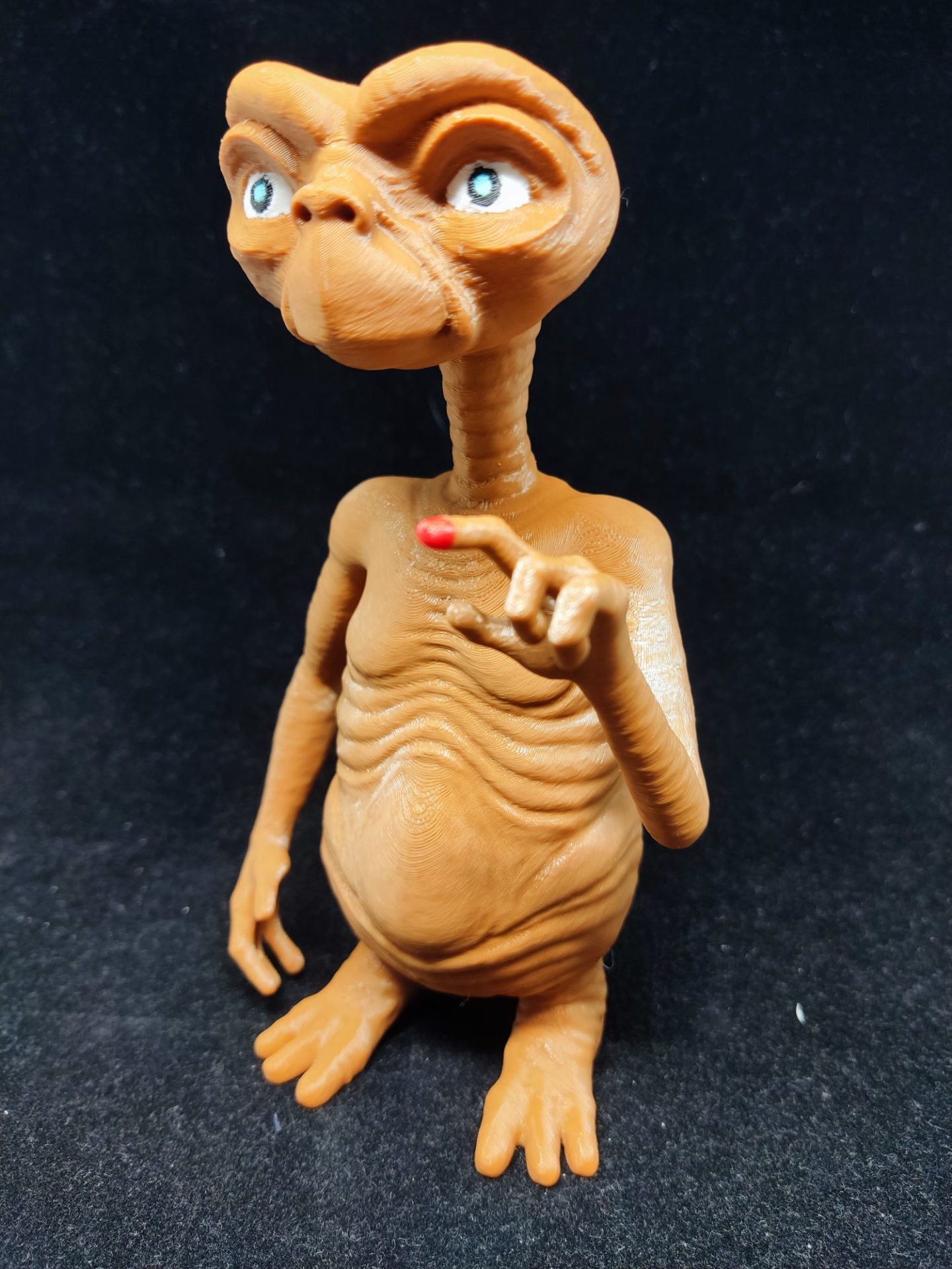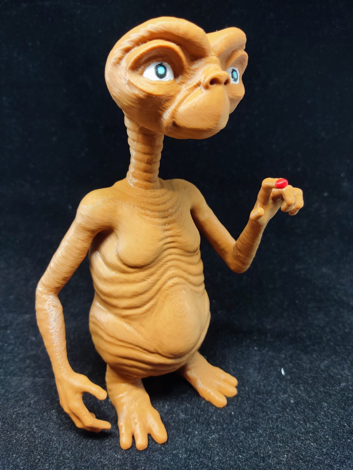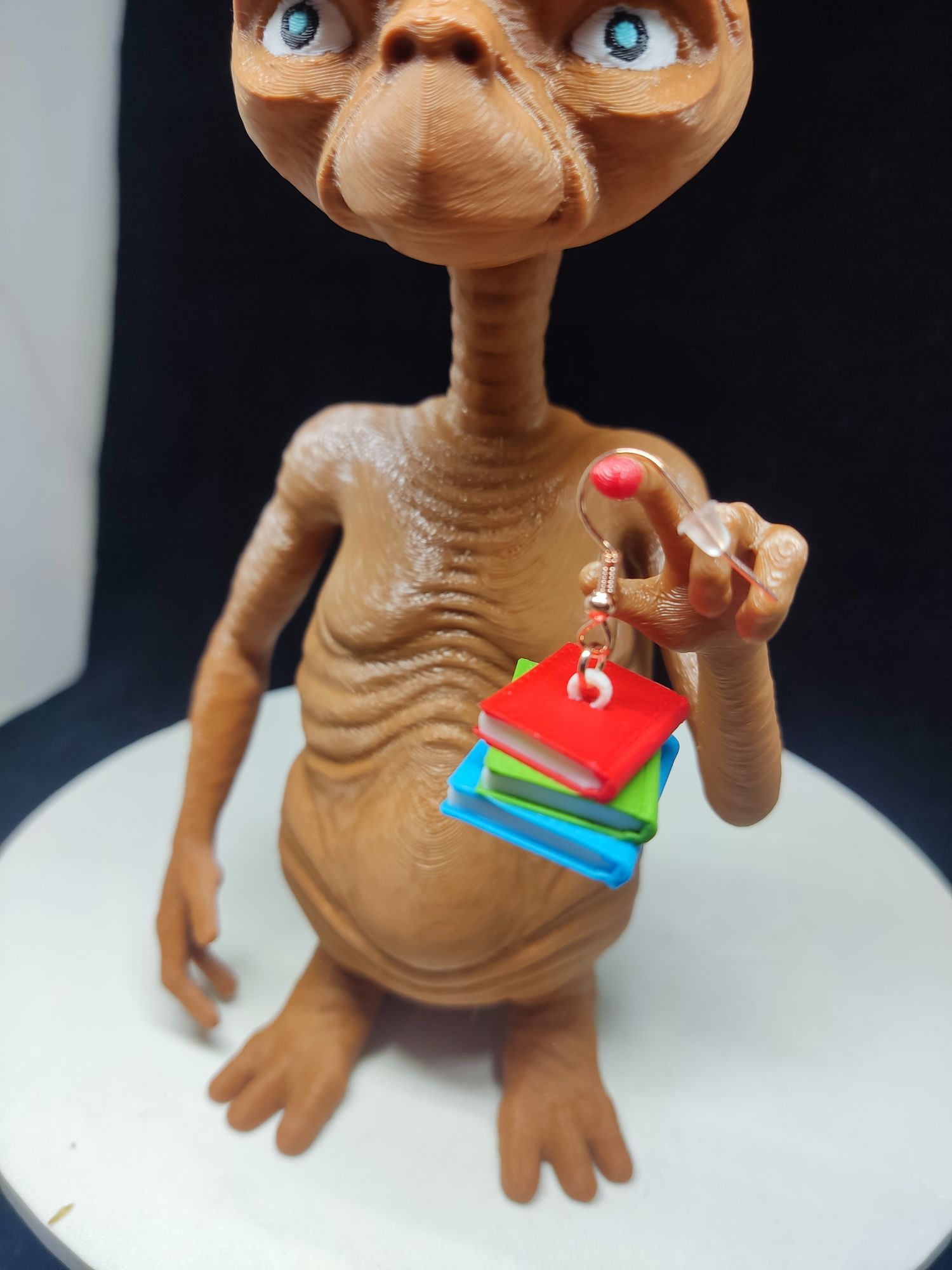 Impreso en 3D multicolor, este muñeco captura cada detalle del adorable alienígena, desde su piel texturizada hasta sus expresivos ojos azules.