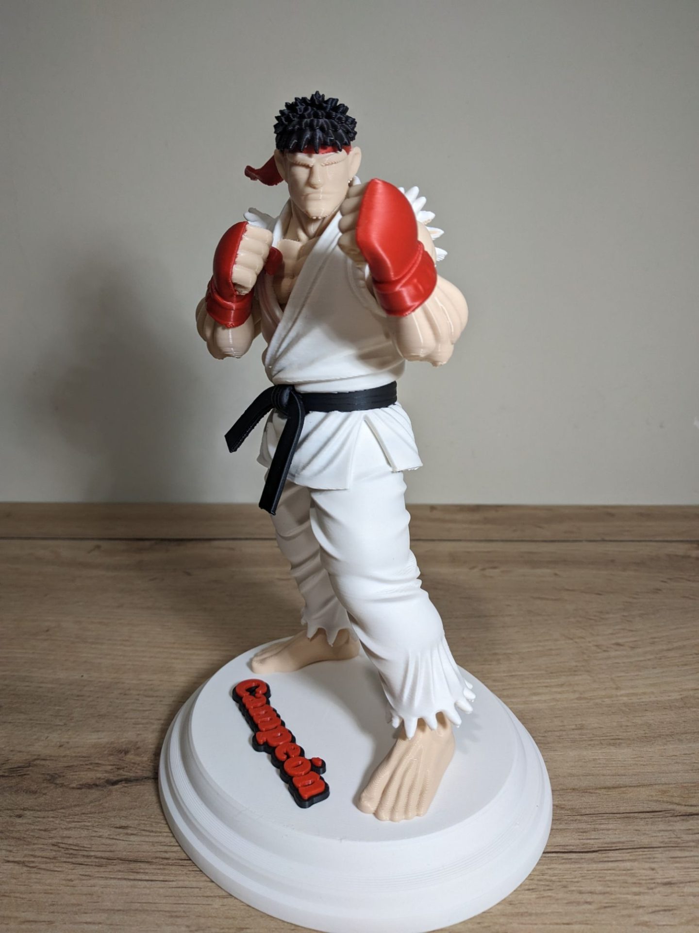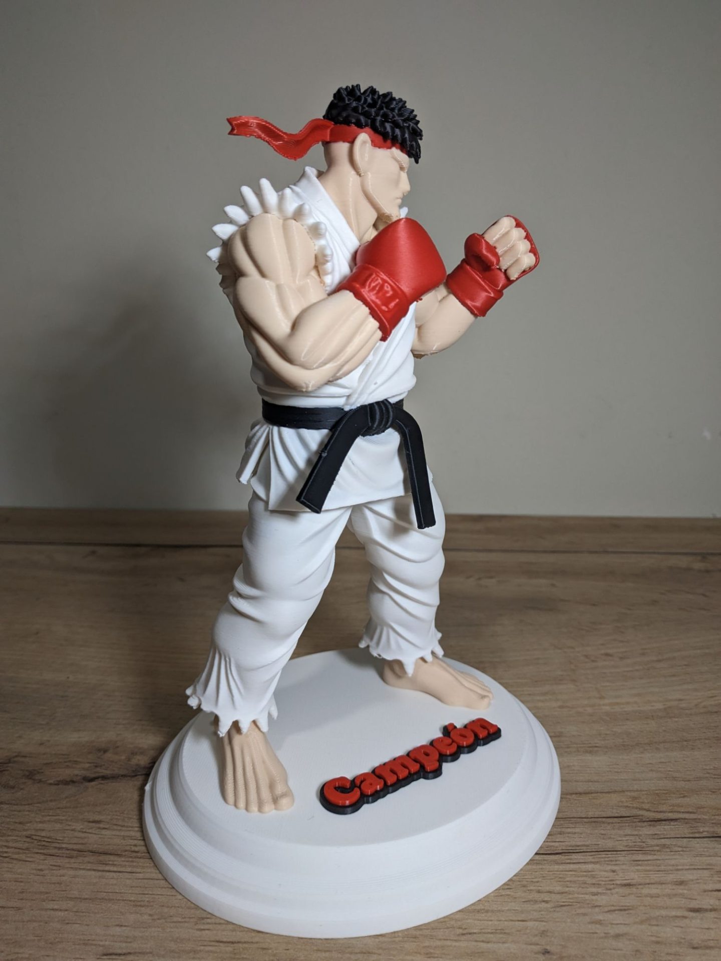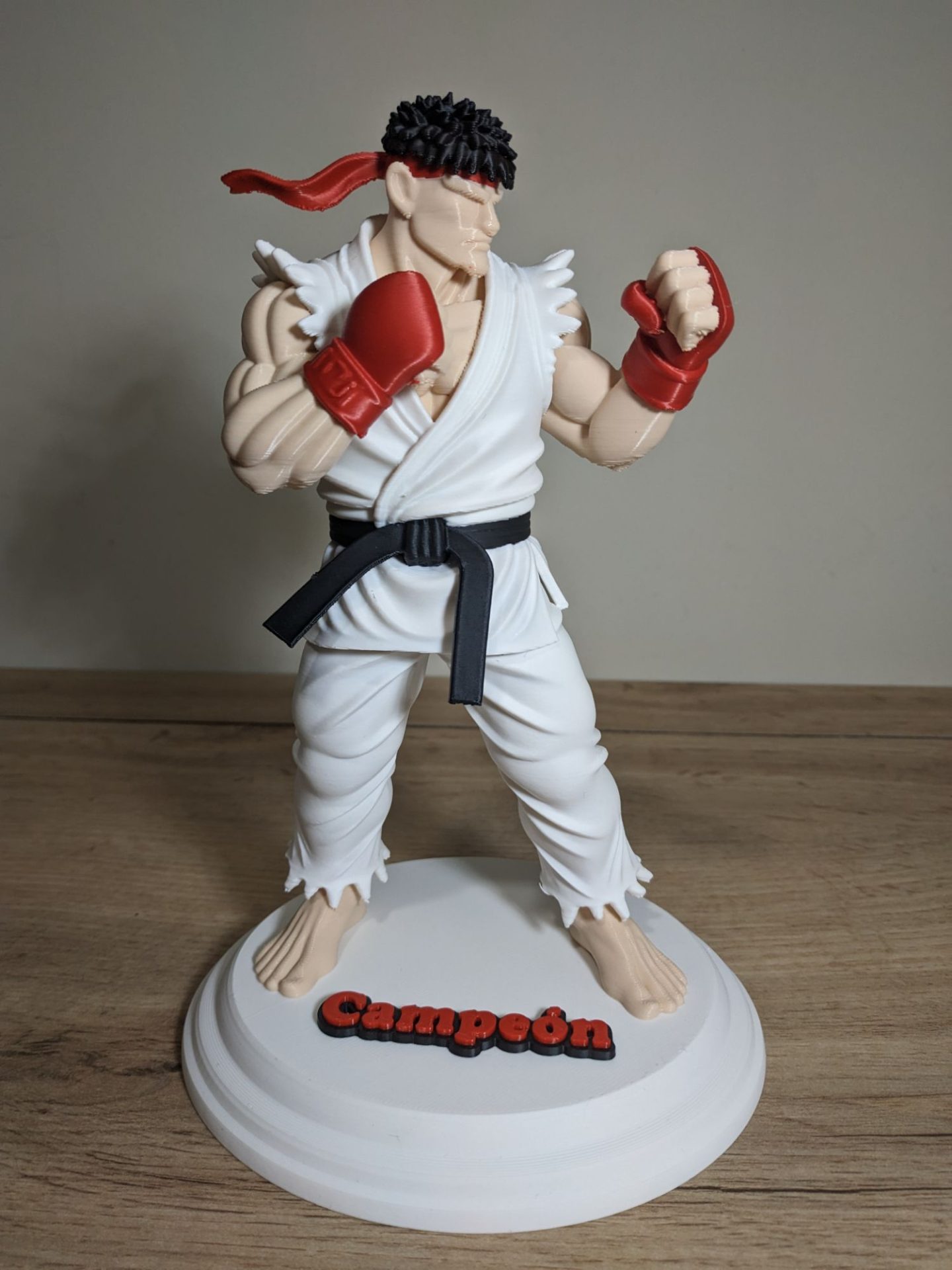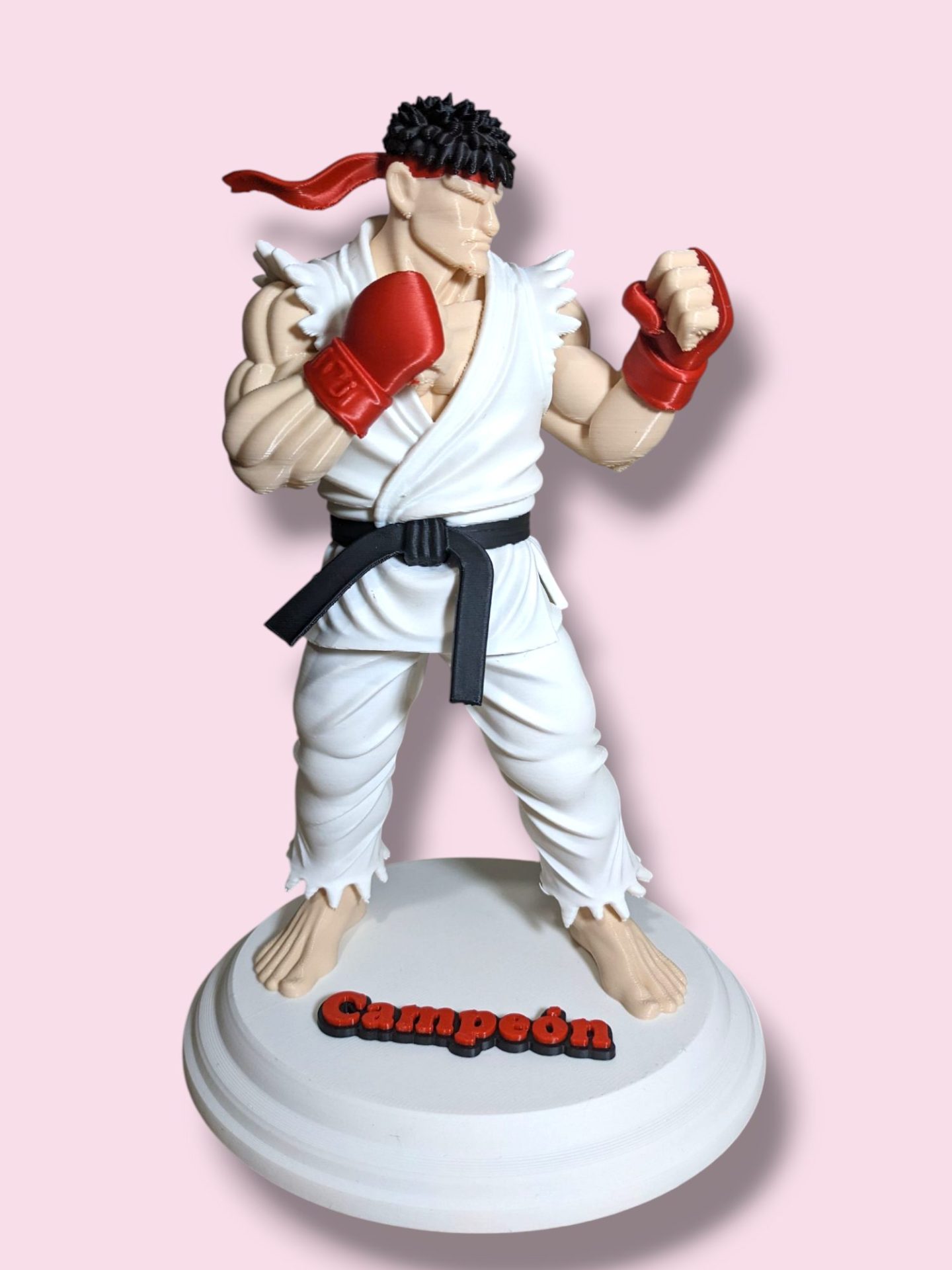 Esta pieza ha sido fabricada mediante impresión 3D de alta resolución, utilizando tecnología multicolor real. Esto significa que los colores (blanco del karategui, rojo de los guantes y la cinta, negro del cinturón y el tono de la piel) están integrados directamente en el material, ofreciendo un acabado limpio y profesional sin necesidad de pintura posterior.