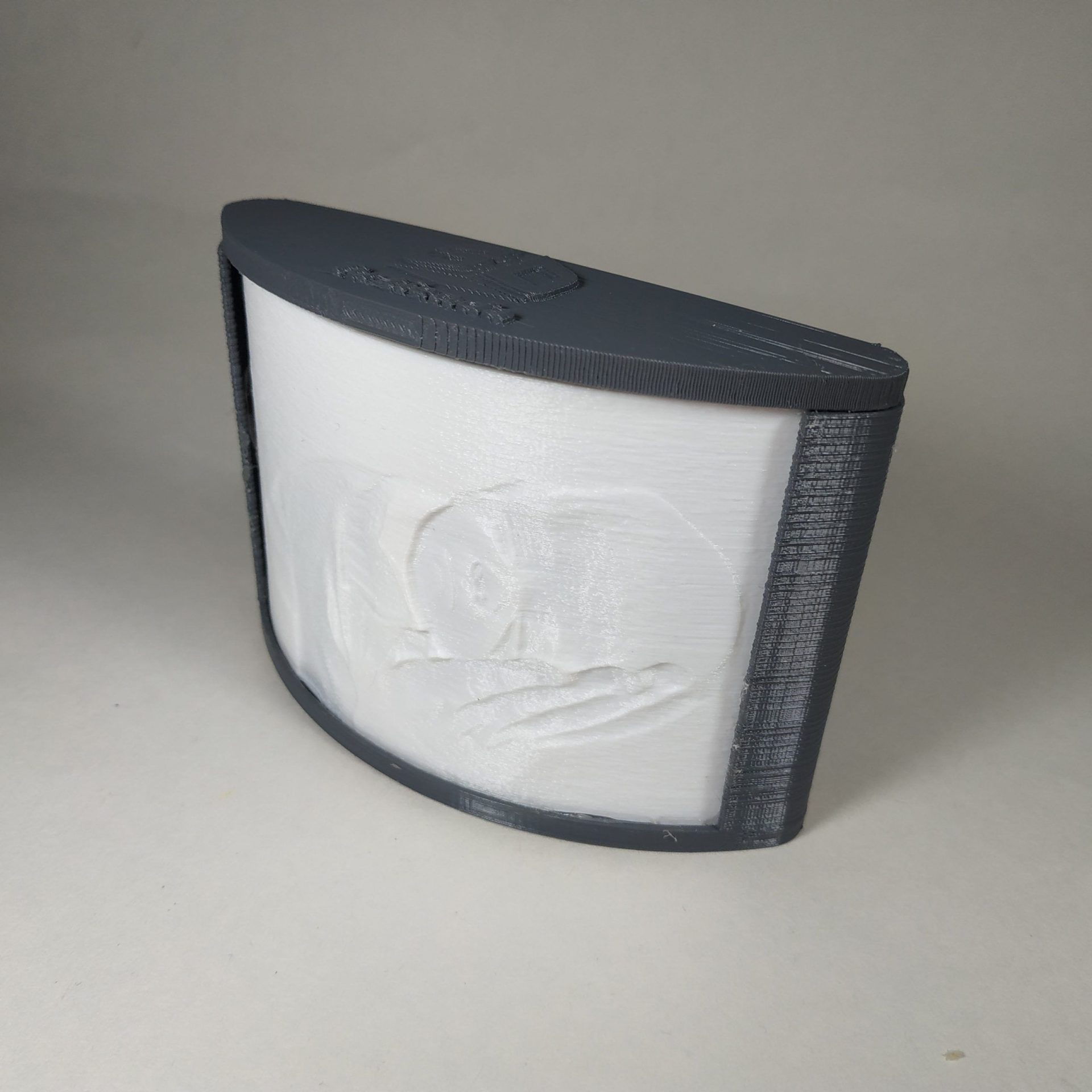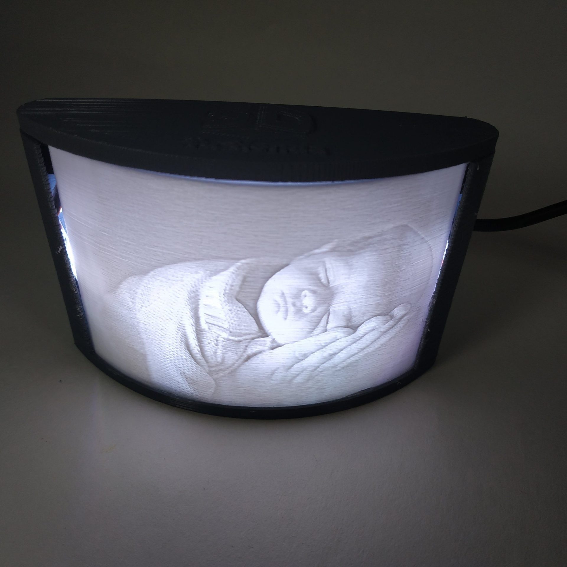 Las litofanías personalizadas de Tutienda3D, tienen forma de semicírculo, con una lámina curva y llevan incorporadas unas luces leds en su interior, con cable USB para que puedas conectarla a cualquier cargador de Móvil o Tablet con salida USB (no incluido). Elige el tamaño, tu foto en 3D preferida, el color de la caja que más te guste y la inscripción que prefieras. Deja a todos sorprendidos con este magnífico regalo. Tamaño Pequeño 7.5×11