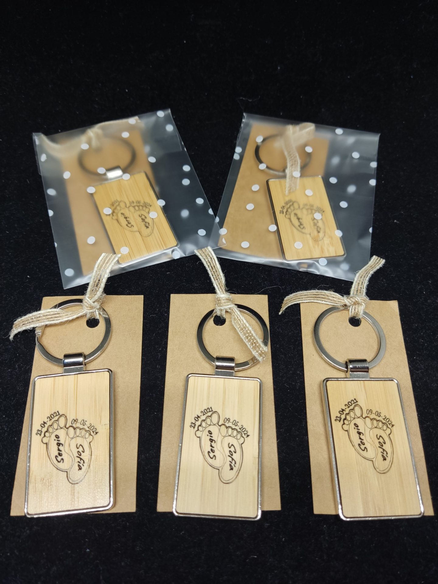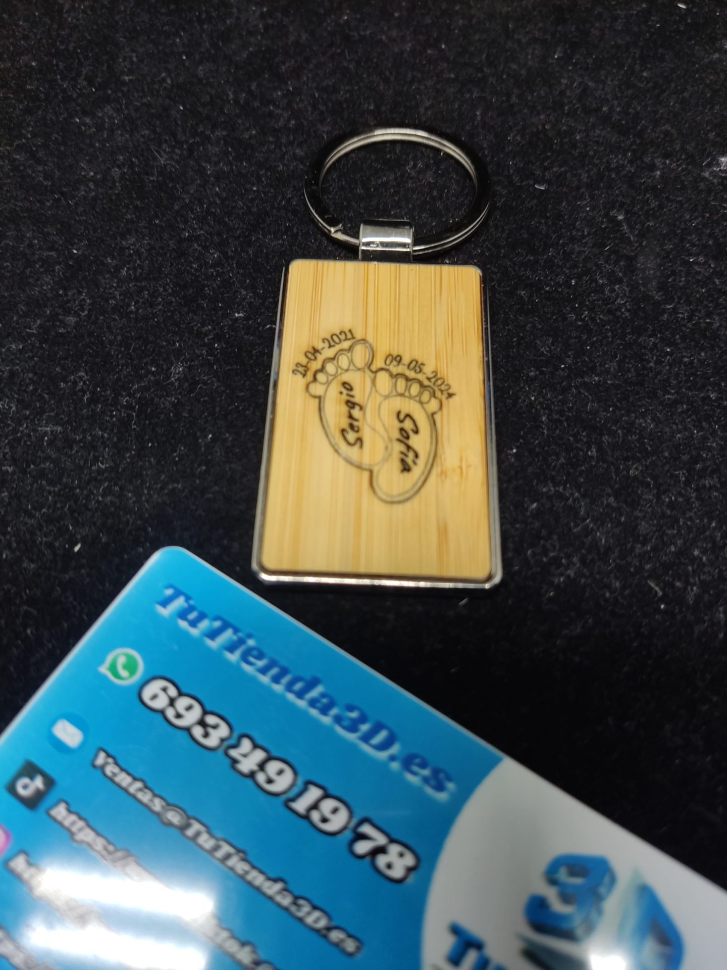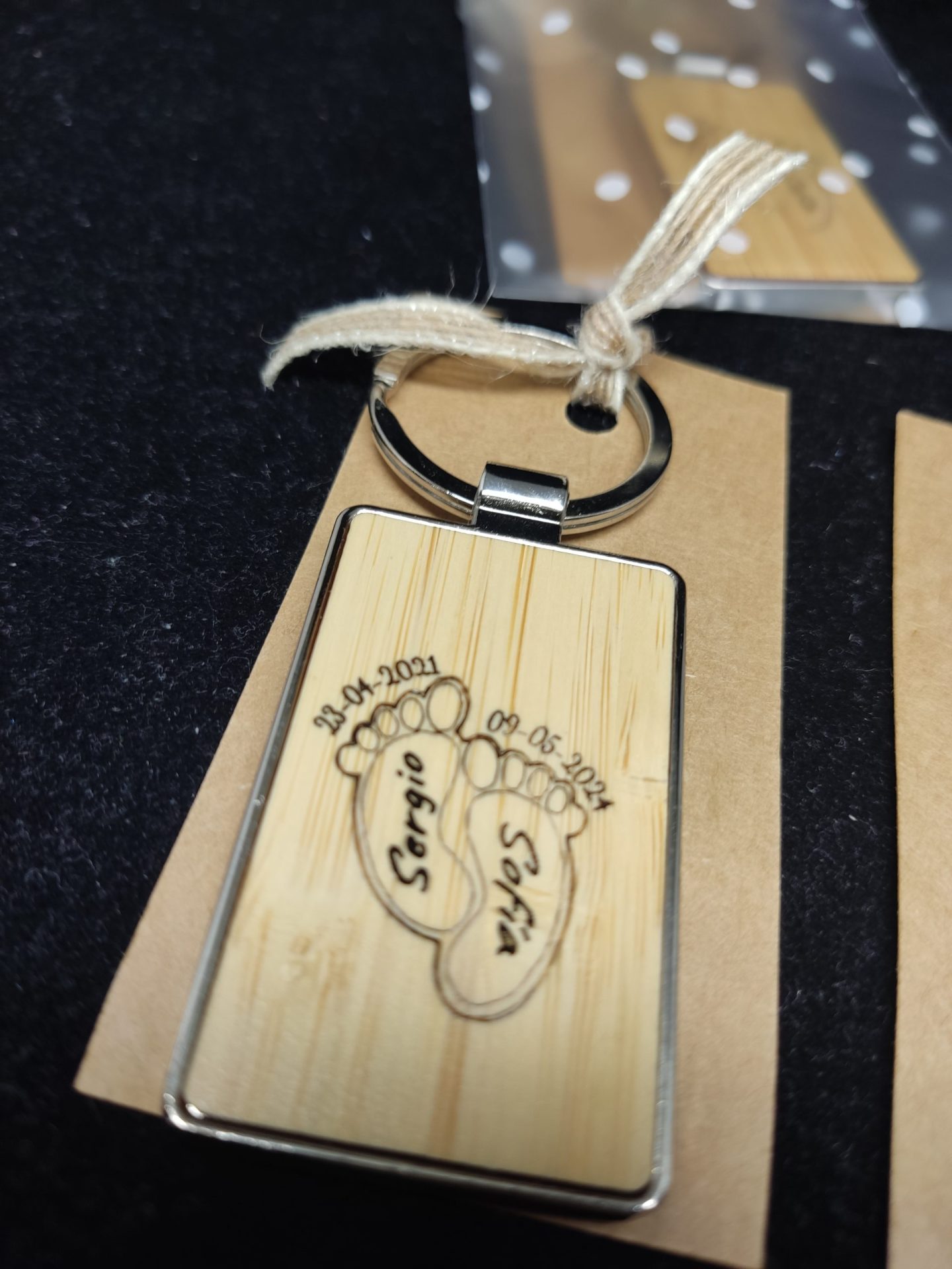 Llavero de metal y bambú rectangular grabado a láser con mensaje personalizado.