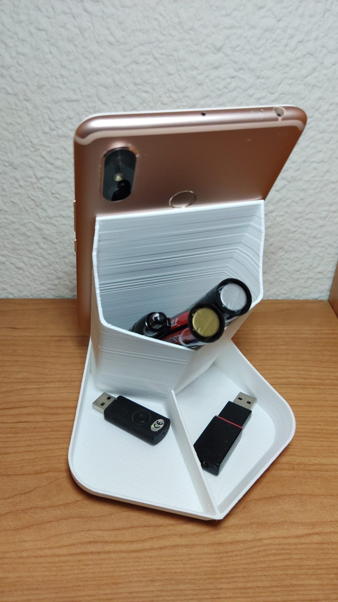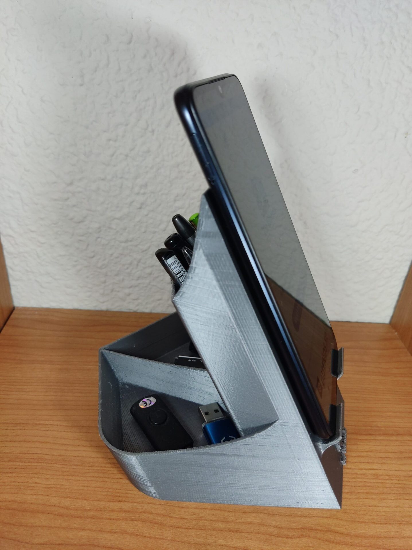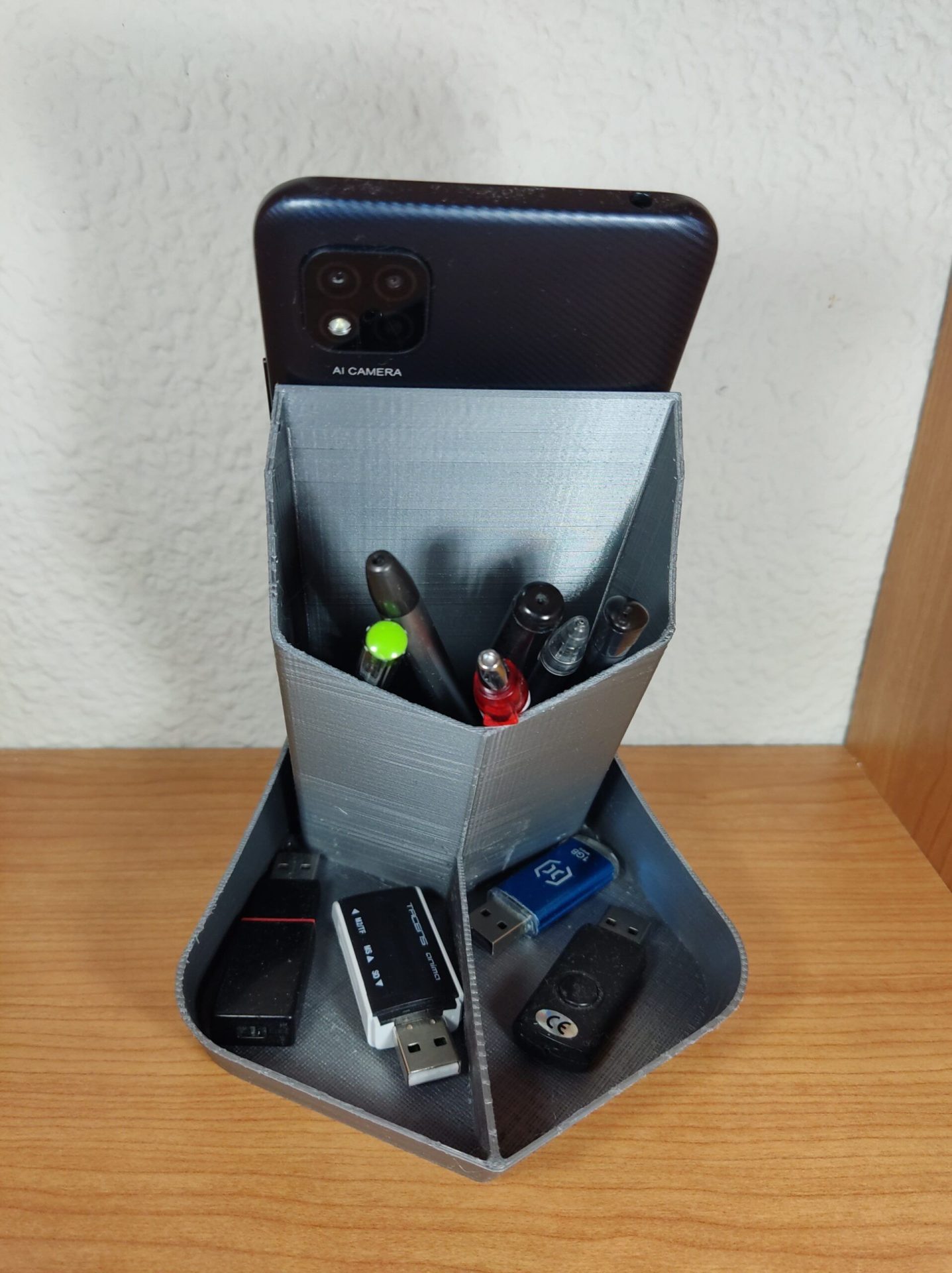 Sirve para guardar los pendrives los clips, bolígrafos, lápices se puede cargar el móvil mientras se usa.